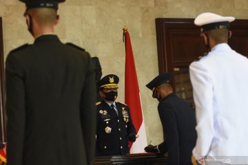Panglima TNI Marsekal TNI Hadi Tjahjanto (kiri) menyaksikan perwakilan perwira menandatangani naskah berita acara pengambilan sumpah saat pelantikan Perwira Prajurit Karier TNI tahun 2020 di Mabes TNI Cilangkap, Kamis (16/7/2020). Sebanyak 208 Perwira Prajurit Karier TNI yang dilantik terdiri dari Matra Darat 115 personel, Matra Laut 40 personel, dan Matra Udara 53 personel. ANTARA FOTO/Indrianto Eko Suwarso/hp.