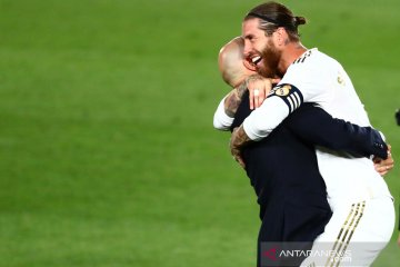 Pemain Real Madrid Sergio Ramos berpelukan dengan pelatih Zinedine Zidane saat merayakan juara La Liga usai menang atas Villarreal di stadion Alfredo Di Stefano, Madrid, Jumat (17/7/2020) dini hari. Real Madrid memastikan diri menjadi juara La Liga setelah mengalahkan Villarreal 2-1 dan Barcelona dikalahkan Osasuna. ANTARA FOTO/REUTERS/Sergio Perez/pras.
