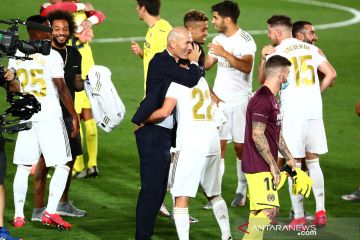 Pemain Real Madrid merayakan juara La Liga usai menang atas Villarreal di stadion Alfredo Di Stefano, Madrid, Jumat (17/7/2020) dini hari. Real Madrid memastikan diri menjadi juara La Liga setelah mengalahkan Villarreal 2-1 dan Barcelona dikalahkan Osasuna. ANTARA FOTO/REUTERS/Sergio Perez/pras.