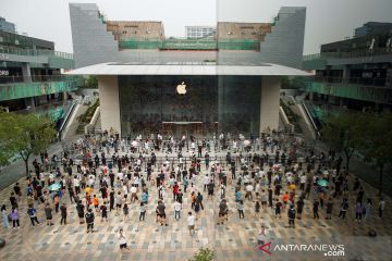 Pengunjung mengantre dengan menjaga jarak fisik saat menunggu pembukaan toko flagship Apple yang baru di Sanlitun di Beijing, China, 17 Juli 2020. ANTARA FOTO/REUTERS / Thomas Pete/aww.