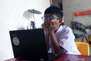 Seorang murid baru tingkat Sekolah Dasar (SD) mengikuti Masa Pengenalan Lingkungan Sekolah (MPLS) secara daring dari rumahnya di Blitar, Jawa Timur, Senin (13/7/2020). Memasuki masa hari pertama masuk sekolah tahun ajaran baru 2020 ini, Kemendikbud hanya memberikan ijin pemberlakuan masuk sekolah secara tatap muka terhadap 104 kabupaten/kota di seluruh indonesia yang termasuk zona hijau dalam peta penyebaran COVID-19, sedangkan bagi kabupaten/kota lainnya yang masih termasuk dalam zona kuning dan merah, masih harus memberlakukan pembelajaran melalui sistem daring dari rumah. ANTARA FOTO/Irfan Anshori/wsj.