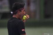 Petenis tunggal putra Rifki Fitriadi menggigit bola pada final turnamen Simulasi Internal Pelatnas Putra PP Pelti di Stadion Tenis Gelora Bung Karno, Jakarta, Selasa (14/7/2020). Christopher memenangi pertandingan melawan Rifki dengan skor akhir 2-0 (7-5, 6-4). ANTARA FOTO/Nova Wahyudi/foc.