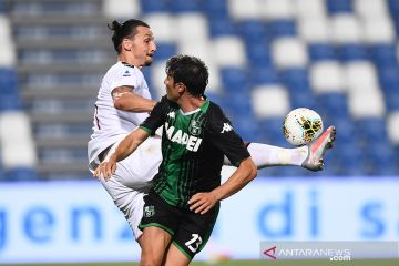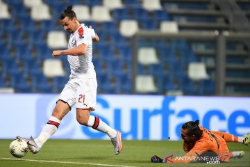 Pemain AC Milan Zlatan Ibrahimovic mencetak gol kedua ke gawang Sassuolo pada pertandingan Liga Italia Serie A di Stadion Mapei, Sassuolo. Rabu (222/7/2020). Milan menang dengan skor 2-1. ANTARA FOTO/Matteo Gribaudi / BILDBYRÃ via Reuters/pras.