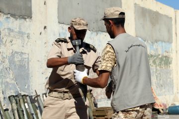 Pasukan pemerintah Libya yang didukung PBB memindahkan sisa-sisa bahan peledak di sebuah kamp militer di Tripoli selatan, Libya, Rabu (22/7/2020). Kementerian Pertahanan Libya dari pemerintahan yang didukung PBB pada Rabu (22/7) menghancurkan bahan peledak sisa perang dari berbagai daerah konflik di Tripoli selatan. ANTARA FOTO/Xinhua-Hamza Turkia/hp.