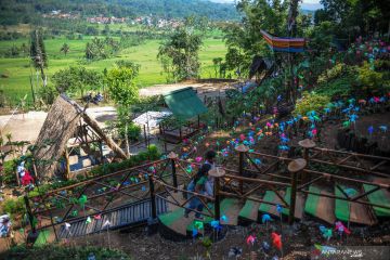 Sejumlah anak bermain diantara hiasan kincir angin di Desa Wisata Lahan Hutan Raya Mulung Layung di Babakan Cipanas, Kabupaten Sumedang, Jawa Barat, Sabtu (25/7/2020). Warga Desa Cipanas berinisiatif untuk merubah lahan hutan yang tidak terpakai untuk dijadikan tempat wisata secara swadaya guna mendongkrak perekonomian warga di Desa. ANTARA FOTO/Raisan Al Farisi/hp.