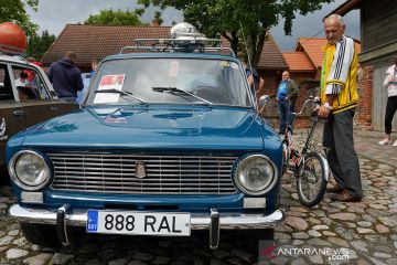 Seorang pria melihat model Lada VAZ 2101 saat parade untuk peringatan 50 tahun merek di Varbuse, Estonia 25 Juli 2020. ANTARA FOTO/REUTERS / Janis Laizans/aww.
