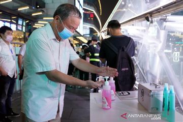 Seorang pria mendisinfeksi tangannya sebelum memasuki lokasi acara Pemutaran Film Outdoor Festival Film Internasional Shanghai di Shanghai, China timur, Sabtu (25 Juli 2020) . Festival Film Internasional Shanghai dibuka di Shanghai pada Sabtu (25/7). Untuk pertama kalinya, gelaran ini meluncurkan pemutaran film di luar ruangan (outdoor), yang mencakup tujuh distrik bisnis dan lebih dari 30 komunitas di Shanghai. ANTARA FOTO/Xinhua/Liu Ying/pras.