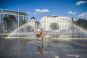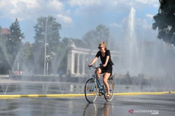 Seorang pesepeda melewati semprotan air di Schwarzenbergplatz di Wina, Austria, Selasa (28/7/2020). Suhu tertinggi di Wina mencapai angka 37,2 derajat Celsius pada Selasa kemaren. ANTARA FOTO/Xinhua-Guo Chen/hp.