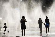 Sejumlah warga menyejukkan diri di dekat semprotan air di Schwarzenbergplatz di Wina, Austria, Selasa (28/7/2020). Suhu tertinggi di Wina mencapai angka 37,2 derajat Celsius pada Selasa kemaren. ANTARA FOTO/Xinhua-Guo Chen/hp.