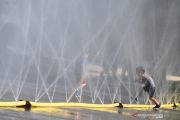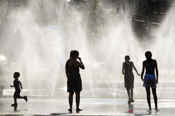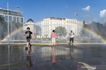 Anak-anak menyejukkan diri di dekat semprotan air di Schwarzenbergplatz di Wina, Austria, Selasa (28/7/2020). Suhu tertinggi di Wina mencapai angka 37,2 derajat Celsius pada Selasa kemaren. ANTARA FOTO/Xinhua-Guo Chen/hp.