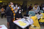 Petugas mengalungkan bunga untuk menyambut penumpang pesawat rute domestik yang tiba di Bandara Internasional I Gusti Ngurah Rai, Badung, Bali, Jumat (31/7/2020). Pemprov Bali mulai membuka sektor pariwisata bagi wisatawan domestik pada Jumat (31/7) dengan sejumlah persyaratan yang mengedepankan aspek kesehatan dan kualitas untuk memberi pelindungan, kenyamanan dan keamanan bagi wisatawan yang berkunjung selama masa pandemi COVID-19. ANTARA FOTO/Fikri Yusuf/pras.