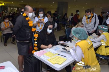 Petugas memeriksa dokumen kesehatan penumpang pesawat rute domestik yang tiba di Bandara Internasional I Gusti Ngurah Rai, Badung, Bali, Jumat (31/7/2020). Pemprov Bali mulai membuka sektor pariwisata bagi wisatawan domestik pada Jumat (31/7) dengan sejumlah persyaratan yang mengedepankan aspek kesehatan dan kualitas untuk memberi pelindungan, kenyamanan dan keamanan bagi wisatawan yang berkunjung selama masa pandemi COVID-19. ANTARA FOTO/Fikri Yusuf/pras