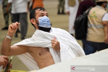 Jamaah melakukan prosesi melempar jumrah saat pelaksanaan ibadah haji di tengah pandemi COVID-19 di Mina, Arab Saudi, Jumat (31/7/2020). ANTARA FOTO/Saudi Ministry of Media/Handout via REUTERS/pras.