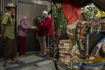 Pengurus Dewan Kemakmuran Masjid (DKM) membagikan daging kurban menggunakan besek (wadah anyaman bambu) kepada warga di kawasan Cihapit, Bandung, Jawa Barat, Jumat (31/7/2020). Pengurus DKM menggunakan besek untuk mengemas daging kurban seberat satu kilogram guna mengurangi sampah plastik serta membagikan kepada warga penerima secara langsung dari rumah ke rumah sebagai penerapan protokol kesehatan pada masa Adaptasi Kebiasaan Baru pandemi COVID-19 di Hari Raya Idul Adha. ANTARA FOTO/Novrian Arbi/wsj.