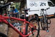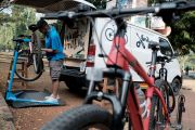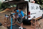 Mekanik memperbaiki sepeda di bengkel bergerak Sumber Dua Roda (S2R) di Universitas Indonesia, Depok, Jabar, Sabtu (1/8/2020). Bengkel sepeda tersebut mengusung konsep "mobile" dengan mendatangi langsung tempat-tempat bersepeda dan komunitas berkumpul sehingga memudahkan mereka yang ingin melakukan perbaikan. ANTARA FOTO/Prasetyo Utomo/hp.