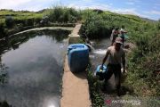 Seorang warga Sungai Jambu menampung air yang mengalir dari sumber mata air di kaki Gunung Kerinci, Kayu Aro Barat, Kerinci, Jambi, Minggu (2/8/2020). Beberapa desa yang wilayahnya belum mendapatkan layanan Perusahaan Daerah Air Minum (PDAM) di daerah itu memanfaatkan sumber mata air di kaki Gunung Kerinci untuk kebutuhan sehari-hari. ANTARA FOTO/Wahdi Septiawan/aww.