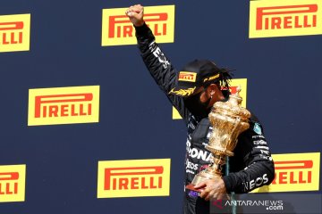 Pembalap Mercedes Lewis Hamilton memeluk trofi juara balapan F1 2020 GP Inggris di Sirkuit Silverstone, Minggu (2/8/2020). Meski dengan kondisi ban pecah, Hamilton tetap berhasil menjadi juara balapan tersebut, mengungguli pembalap Red Bull Racing Marx Verstapen di posisi kedua dan pembalap Ferrari Charles Leclrec di posisi ketiga. ANTARA FOTO/Pool via REUTERS/Andrew Boyers/aww.