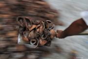 Pekerja mengumpulkan kopra kering di kawasan terminal hasil bumi di Kendari, Sulawesi Tenggara, Senin (3/8/2020). Harga kopra turun dari Rp7.500 menjadi Rp6.400 per kilogramnya akibat melimpahnya pasokan buah kelapa dan turunnya permintaan dari Surabaya. ANTARA FOTO/Jojon/wsj.