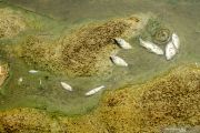 Sejumlah ikan mati di Daerah Aliran Sungai (DAS) Citarum yang tercemar di Karawang, Jawa Barat, Selasa (4/8/2020). Kondisi air DAS Citarum tersebut berubah warna menjadi hitam dan mengeluarkan bau menyengat yang diduga akibat pencemaran limbah industri sehingga menganggu aktivitas warga dan merusak ekosistem. ANTARA FOTO/M Ibnu Chazar/wsj.