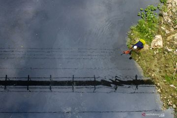 Warga melihat kondisi air di Daerah Aliran Sungai (DAS) Citarum yang tercemar di Karawang, Jawa Barat, Selasa (4/8/2020). Kondisi air DAS Citarum tersebut berubah warna menjadi hitam dan mengeluarkan bau menyengat yang diduga akibat pencemaran limbah industri sehingga menganggu aktivitas warga dan merusak ekosistem. ANTARA FOTO/M Ibnu Chazar/wsj.