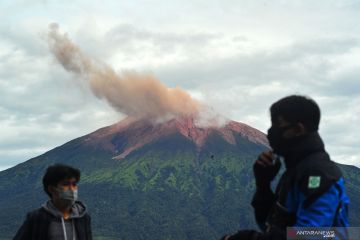 Gunung Kerinci mengembuskan gas dan material yang terlihat dari Gunung Tujuh, Kerinci, Jambi, Rabu (5/8/2020). Pos Pengamatan Gunung Api Kerinci menyebutkan Gunung Kerinci yang statusnya masih berada pada level II (waspada) kembali mengalami gempa embusan dan tremor menerus yang terpantau secara visual dan data seismik pada Rabu (5/8) pagi. ANTARA FOTO/Wahdi Septiawan/hp.