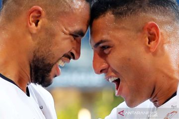Pemain Sevilla Youssef En-Nesyri (kiri) merayakan golnya dengan rekannya Diego Carlos saat laga babak 16 besar Liga Europa melawan AS Roma di MSV-Arena, Duisburg, Jerman, 6 Agustus 2020. Sevilla berhasil mengalahkan Roma dengan skor 2-0 melalui gol Sergio Reguilon dan Youssef En-Nesyri. ANTARA FOTO/Pool via REUTERS/WOLFGANG RATTAY/aww.