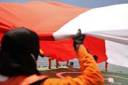 Foto udara bendera merah putih raksasa dibentangkan di atas KN SAR Pacitan di sekitar Pulau Hari, Kabupaten Konawe, Sulawesi Tenggara, Sabtu (8/8/2020). Aksi pembentangan bendera merah putih berukuran 25 x 17 meter itu untuk menyambut Hari Ulang Tahun ke-75 Republik Indonesia. ANTARA FOTO/Jojon/wsj.