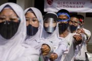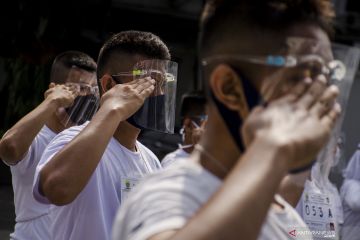 Tim Paskibaraka Kota Bandung melakukan latihan menggunakan masker dan pelindung wajah di Balai Kota Bandung, Jawa Barat, Minggu (9/8/2020). Latihan tersebut sebagai persiapan untuk upacara peringatan HUT ke-75 Kemerdekaan Republik Indonesia tingkat Kota Bandung dengan menyesuaikan kondisi adaptasi kebiasaan baru pandemi melalui penerapan protokol kesehatan dan pengurangan jumlah tim paskibraka pengibar dan penurunan bendera merah putih. ANTARA FOTO/Novrian Arbi/foc.