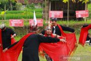 Gandrung Temu menari bersama pada peringatan Hari Internasional Masyarakat Adat Sedunia (HIMAS) di Sawah Art Space Desa Adat Kemiren, Banyuwangi, Jawa Timur, Minggu (9/8/2020). Peringatan HIMAS pada masa Pandemi COVID-19 ini, digelar masyarakat suku Osing di area persawahan dengan mengangkat tema "Kedaulatan Pangan dan Pengakuan Masyarakat Adat". ANTARA FOTO/Budi Candra Setya/aww.