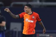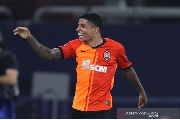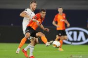 Pesepak bola Shakhtar Donetsk Dodo melakukan selebrasi setelah berasil membuat gol keempat untuk timnya saat melawan Basel dalam laga babak perempat final Liga Europa, di Veltins-Arena, Gelsenkirchen, Jerman, Selasa (11/8/2020). Shakhtar Donetsk berhasil mengalahkan Basel 4-1 dan akan berjumpa Inter Milan di semifinal Liga Europa. ANTARA FOTO/Pool via Reuters-Wolfgang Rattay/hp.