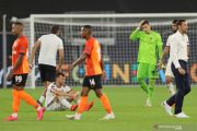 Pesepak bola Basel Silvan Widmer (ketiga kiri) terlihat kecewa setelah pertandingan usai melawan Shakhtar Donetsk dalam laga babak perempat final Liga Europa, di Veltins-Arena, Gelsenkirchen, Jerman, Selasa (11/8/2020). Shakhtar Donetsk berhasil mengalahkan Basel 4-1 dan akan berjumpa Inter Milan di semifinal Liga Europa. ANTARA FOTO/Pool via Reuters-Wolfgang Rattay/hp.