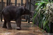 Seekor bayi gajah sumatera (Elephas maximus sumatrensis) berkelamin betina memakan rumput di kandang Taman Safari Prigen, Pasuruan, Jawa Timur, Rabu (12/8/2020). Bayi gajah yang lahir pada 14 Juli 2020 dengan berat 80 kg dan tinggi 85 cm dari indukan betina bernama Siska dan pejantan bernama Wahid tersebut menambah koleksi gajah sumatera di taman itu menjadi 20 ekor. ANTARA FOTO/Umarul Faruq/wsj.