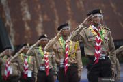 Sejumlah peserta melakukan penghormatan dalam upacara perkemahan Hari Pramuka di Bumi Perkemahan Pramuka, Cibubur, Jakarta, Jumat (14/8/2020). Perkemahan yang digelar Saka Wira Kartika TNI AD tersebut diikuti 500 anggota Pramuka se-Jabodetabek dan dilakukan dengan menerapkan protokol kesehatan selama pandemi COVID-19, seperti penggunaan masker, pelindung wajah, dan penerapan satu tenda satu orang. ANTARA FOTO/Aditya Pradana Putra/foc.
