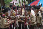 Sejumlah siswa mendirikan gapura bambu dalam perkemahan Hari Pramuka di Bumi Perkemahan Pramuka, Cibubur, Jakarta, Jumat (14/8/2020). Perkemahan yang digelar Saka Wira Kartika TNI AD tersebut diikuti 500 anggota Pramuka se-Jabodetabek dan dilakukan dengan menerapkan protokol kesehatan selama pandemi COVID-19, seperti penggunaan masker, pelindung wajah, dan penerapan satu tenda satu orang. ANTARA FOTO/Aditya Pradana Putra/foc.