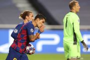 Pesepak bola Bayern Munich Philippe Coutinho (tengah) melakukan selebrasi bersama rekannya setelah berhasil mencetak gol gawang Barcelona dalam laga perempat final Liga Champions, di Estadio da Luz, Lisbon, Portugal, Jumat (14/8/2020). Pertandingan ini berlangsung tertutup tanpa kehadiran penonton karena masih mewabahnya virus Corona (COVID-19) dan Bayern berhasil melaju ke babak semi final setelah mengalahkan Barcelona 8-2 ANTARA FOTO/Pool via Reuters- Rafael Marchante/hp.