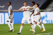 Pesepak bola Bayern Munich Robert Lewandowski (kedua kiri) melakukan selebrasi setelah berhasil membobol gawang Bacelona dalam laga perempat final Liga Champions, di Estadio da Luz, Lisbon, Portugal, Jumat (14/8/2020). Pertandingan ini berlangsung tertutup tanpa kehadiran penonton karena masih mewabahnya virus Corona (COVID-19) dan Bayern berhasil melaju ke babak semi final setelah mengalahkan Barcelona 8-2. ANTARA FOTO/Pool via Reuters- Manu Fernandez/hp.