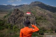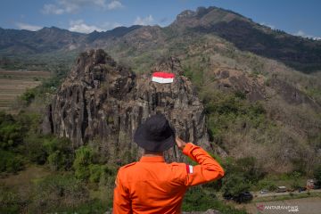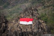 Tim Search and Rescue (SAR) Sukoharjo mengibarkan Bendera Merah Putih di puncak bukit Gunung Sepikul, Sukoharjo, Jawa Tengah, Sabtu (15/8/2020). Pengibaran Bendera Merah Putih berukuran 12X16 meter di atas bukit tersebut untuk menyambut perayaan HUT ke-75 Republik Indonesia. ANTARA FOTO/Mohammad Ayudha/hp.