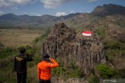 Tim Search and Rescue (SAR) Sukoharjo mengibarkan bendera merah putih di puncak bukit Gunung Sepikul, Sukoharjo, Jawa Tengah, Sabtu (15/8/2020). Pengibaran bendera merah putih berukuran 12X16 meter di atas bukit tersebut untuk menyambut perayaan HUT ke-75 Republik Indonesia. ANTARA FOTO/Mohammad Ayudha/hp.