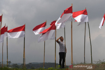 Seorang pengunjung memberi hormat ke bendera Merah Putih yang dipasang di Poetoek Suko, Trawas, Mojokerto, Jawa Timur, Minggu (16/8/2020). Pemasangan ribuan bendera Merah Putih di tempat wisata tersebut guna memeriahkan HUT Kemerdekaan ke-75 RI. ANTARA FOTO/Zabur Karuru/aww.