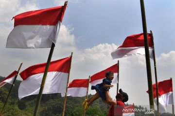 Pengunjung bermain bersama anaknya di antara bendera Merah Putih yang dipasang di Poetoek Suko, Trawas, Mojokerto, Jawa Timur, Minggu (16/8/2020). Pemasangan ribuan bendera Merah Putih di tempat wisata tersebut guna memeriahkan HUT Kemerdekaan ke-75 RI. ANTARA FOTO/Zabur Karuru/aww.