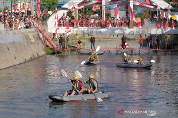 Sejumlah peserta beradu kecepatan dalam balap kayak pada pekan perayaan Hari Kemerdekaan Republik Indonesia di Sungai Mati, Legian, Badung, Bali, Minggu (16/8/2020). Perlombaan tersebut diikuti 32 tim warga lokal dan tiga tim warga negara asing untuk memperingati HUT ke-75 Kemerdekaan Republik Indonesia sekaligus upaya normalisasi sungai yang kini dijadikan destinasi wisata. ANTARA FOTO/Nyoman Hendra Wibowo/aww.