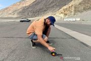 Seorang warga Las Vegas, Grant Mohn mencoba memasak telur di atas sebuah penggorengan di lapangan parkir area Badwater Basin, titik terendah di Amerika Utara, 279 kaki di bawah permukaan air laut di saat cuaca panas ekstrem melanda Taman Nasional Death Valley, California, Amerika Serikat, Senin (17/8/2020). ANTARA FOTO/REUTERS/David Becker/wsj.