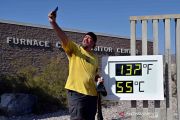 Seorang pengunjung Greg Berndt berswafoto di depan sebuah termometer yang menunjukan suhu 132 derajat Fahreinheit atau 55 derajat Celcius di Pos Pusat Pengunjung Furnace Creek, Taman Nasional Death Valley, California, Amerika Serikat, Senin (17/8/2020). ANTARA FOTO/REUTERS/David Becker/wsj.REUTERS/DAVID BECKER (REUTERS/DAVID BECKER)