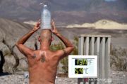 Seorang warga Las Vegas, Steve Krofchik mendinginkan kepalanya dengan botol berisi batu es di depan sebuah termometer yang menunjukan suhu 130 derajat Fahreinheit atau 54,4 derajat Celcius di Pos Pusat Pengunjung Furnace Creek, Taman Nasional Death Valley, California, Amerika Serikat, Senin (17/8/2020). ANTARA FOTO/REUTERS/David Becker/wsj.