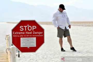 Seorang pria berjalan di hamparan garam di Badwater Basin, titik terendah di Amerika Utara, 279 kaki di bawah permukaan air laut di saat cuaca panas ekstrem melanda Taman Nasional Death Valley, California, Amerika Serikat, Senin (17/8/2020). ANTARA FOTO/REUTERS/David Becker/wsj.