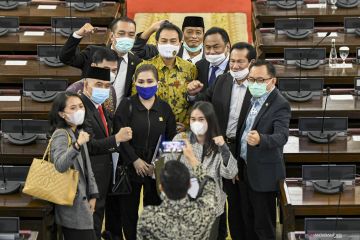 Sejumlah anggota DPR berfoto usai Rapat Paripurna ke-2 Masa Persidangan 2020-2021 di Kompleks Parlemen, Senayan, Jakarta, Selasa (18/8/2020). Rapat Paripurna yang dihadiri 76 orang secara fisik dan 230 orang secara visual tersebut beragendakan pandangan fraksi-fraksi atas RUU tentang Penanggungjawaban atas Pelaksanaan APBN 2019 yang dilakukan pemerintah. ANTARA FOTO/M Risyal Hidayat/hp.