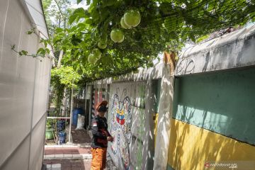 Seorang Petugas Prasarana dan Sarana Umum (PPSU) melakukan perawatan di kawasan pertanian perkotaan, Rawa Badak Selatan, Jakarta Utara, Jumat (21/8/2020). Kawasan tersebut digunakan sebagai wahana edukasi pertanian perkotaan dan ditanami berbagai tanaman yang dapat dimanfaatkan warga sekitar. ANTARA FOTO/Dhemas Reviyanto/foc.