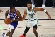 Pebasket Philadelphia 76ers Shake Milton (kiri) membawa bola dan berupaya melewati penjagaan pebasket Boston Celtics Jayson Tatum (kanan) dalam laga gim ketiga playoff NBA, di The Field House, Lake Buena Vista, Florida, Amerika Serikat, Jumat (21/8/2020). Boston Celtics memimpin 3-0 setelah kalahkan Philadelphia 76ers 102 - 94. ANTARA FOTO/USA TODAY Sports-Kim Klement via Reuters/hp. ANTARA FOTO/USA TODAY Sports-Kim Klement via Reuters/hp.