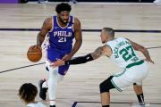 Pebasket Philadelphia 76ers Joel Embiid (kiri) membawa bola dan diajaga pebasket Boston Celtics Daniel Theis (kanan) dalam laga gim ketiga playoff NBA, di The Field House, Lake Buena Vista, Florida, Amerika Serikat, Jumat (21/8/2020). Boston Celtics memimpin 3-0 setelah kalahkan Philadelphia 76ers 102 - 94. ANTARA FOTO/USA TODAY Sports-Kim Klement via Reuters/hp. ANTARA FOTO/USA TODAY Sports-Kim Klement via Reuters/hp.