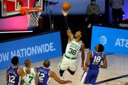 Pebasket Boston Celtics Marcus Smart (kedua kanan) berupaya memasukkan bola ke jaring lawan dan dijaga pebasket Philadelphia 76ers Shake Milton (kanan) dalam laga gim ketiga playoff NBA, di The Field House, Lake Buena Vista, Florida, Amerika Serikat, Jumat (21/8/2020). Boston Celtics memimpin 3-0 setelah kalahkan Philadelphia 76ers 102 - 94. ANTARA FOTO/USA TODAY Sports-Kim Klement via Reuters/hp.